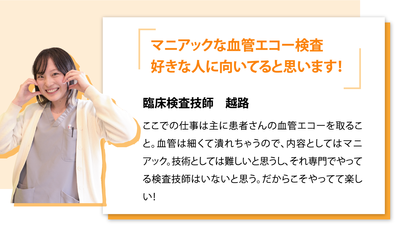 当クリニックの臨床検査技師は検査中の会話を大切にしています。エコーの画像を一緒に見ながら、患者様ご自身が病気に対する理解を深め、不安を解消してもらえるようにコミュニケーションを取りながら検査を行います。 また3つの疾患専門クリニックとはいえ、検査内容はちょっとマニアック。 当クリニックで重視しているのは実践すること。 |