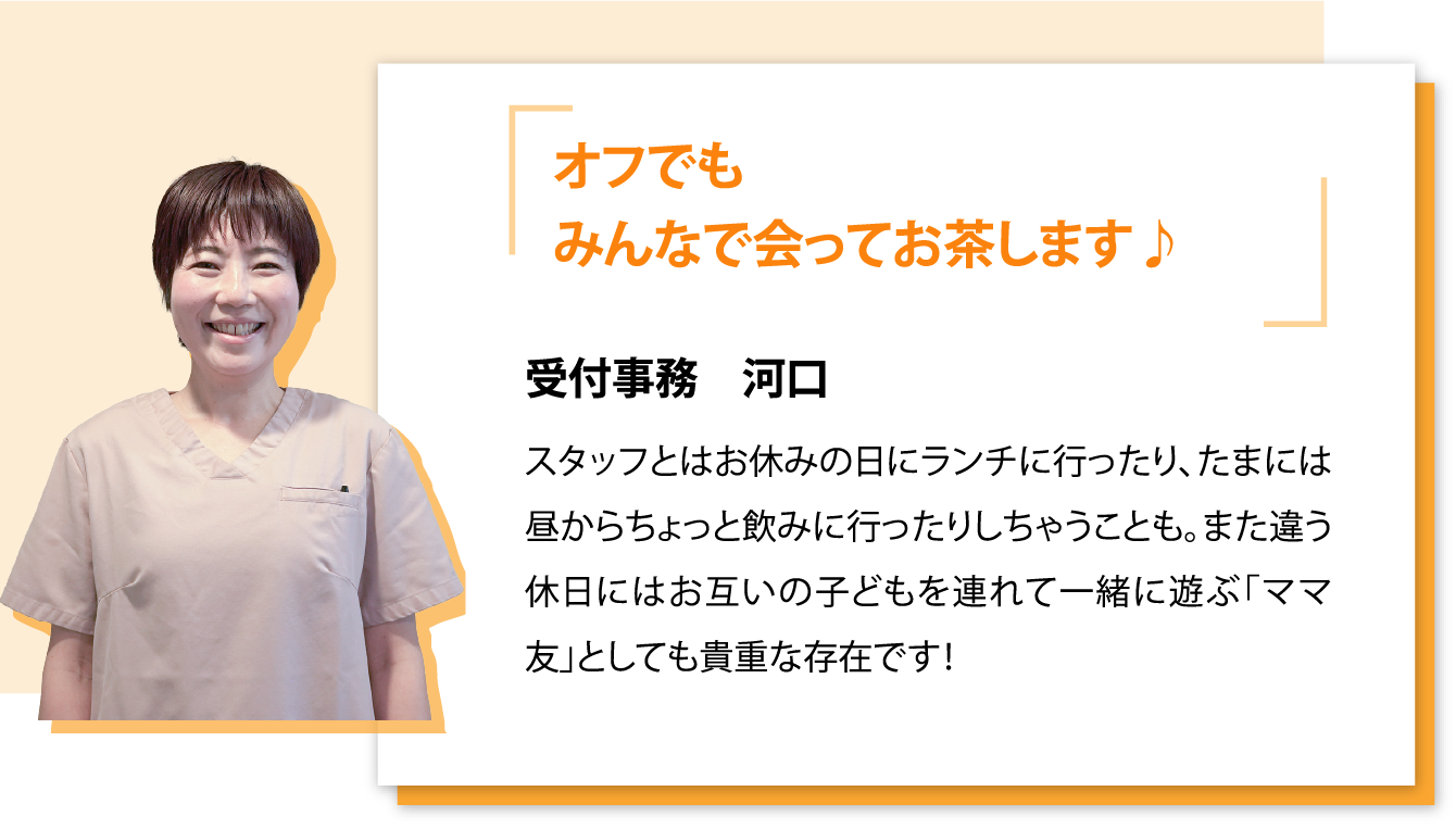 予定がある人は定時であがれるようにスタッフ同士でシフト調整し、プライベートを大切にできるように協力しあっています。