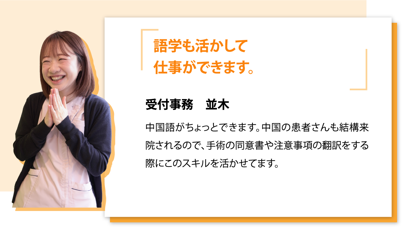 当クリニックの受付事務の仕事の一番の魅力は、受付業務だけでなく診察室や手術室など、クリニック内全部に活躍の場があること。 すべての場に入ることができるので、より患者様の近くで診療に携わることができ、診察の様子や手術の様子を実際に見ることができます。 「そんな知識がない…」と不安になりそうですが、当クリックで行っているのは3つの手術だけ。ドクターズクラークとして、先生の隣でカルテ入力をしていると、知識がどんどん深まります! 更に自分の目で見て得た知識は、本で勉強した知識の何倍も身になります! また、ホームページに新しいコンテンツを作ってみたり、パンフレットを自作してみたりと、クリニックを発展させるための広報事務としても活躍できます。 |