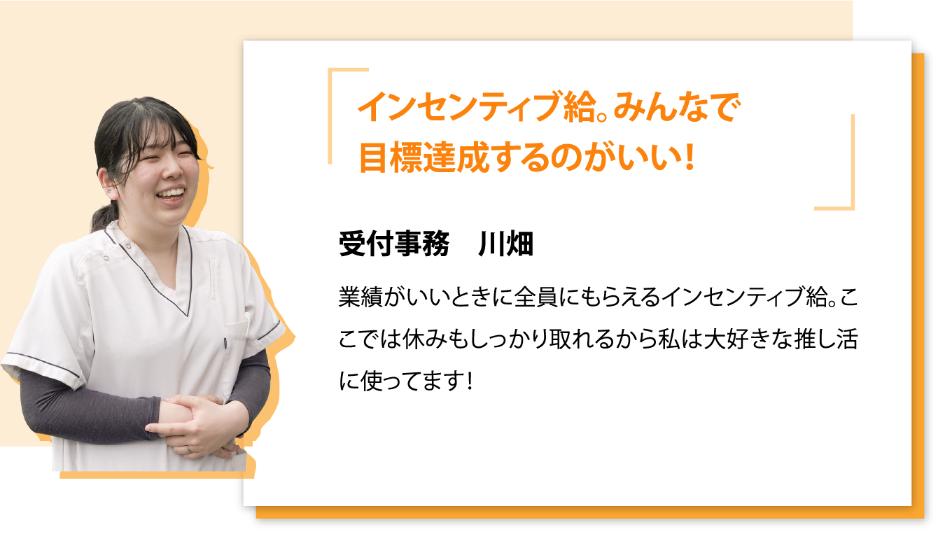 日帰り手術専門のクリニックなので、当然手術の件数が多いほど収益も上がります。当クリニックでは、「インセンティブ給」として、頑張った分だけ収入が増える手当を取り入れています。
